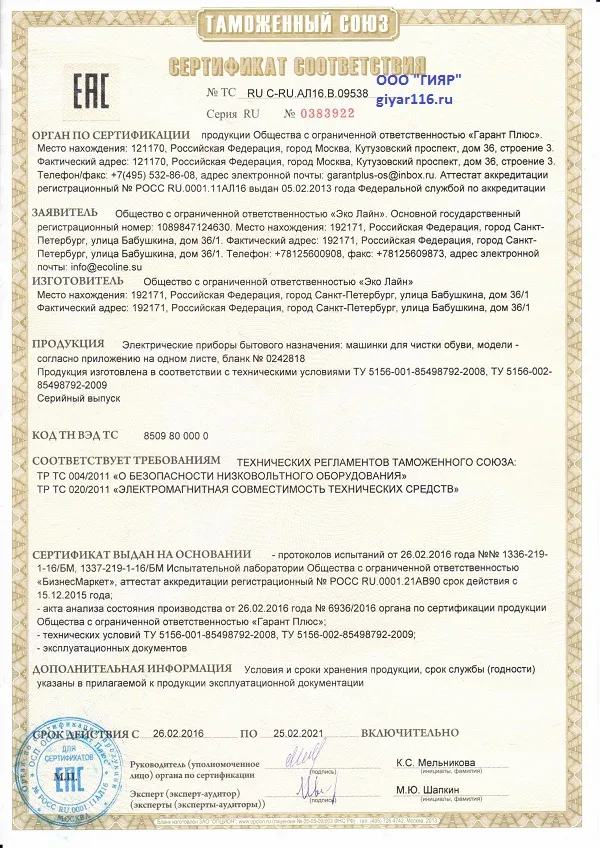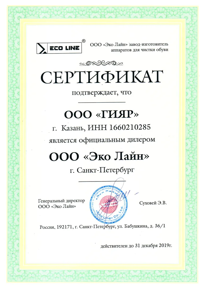 Сертификат дилера Эко Лайн машинки для чистки обуви ООО ГИЯР