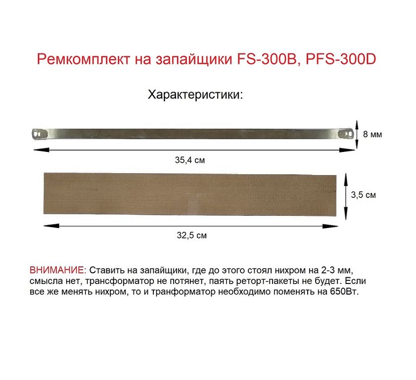 ВНИМАНИЕ: Ставить на запайщики, где до этого стоял нихром на 2-3мм, смысла нет, трансформатор не потянет, паять реторт-пакеты не будет. Если все же менять нихром, то и транформатор необходимо поменять на 650Вт.