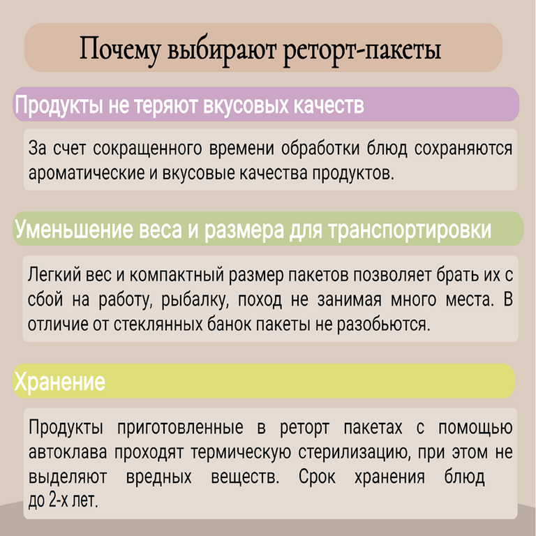 Реторт-пакеты создан для хранения и консервирования продуктов без применения консервантов, состоит из многослойного материала, обладает повышенными защитными свойствами, имеет донную складку, продукты возможно стерилизовать прямо в упаковке при температуре более 100С.