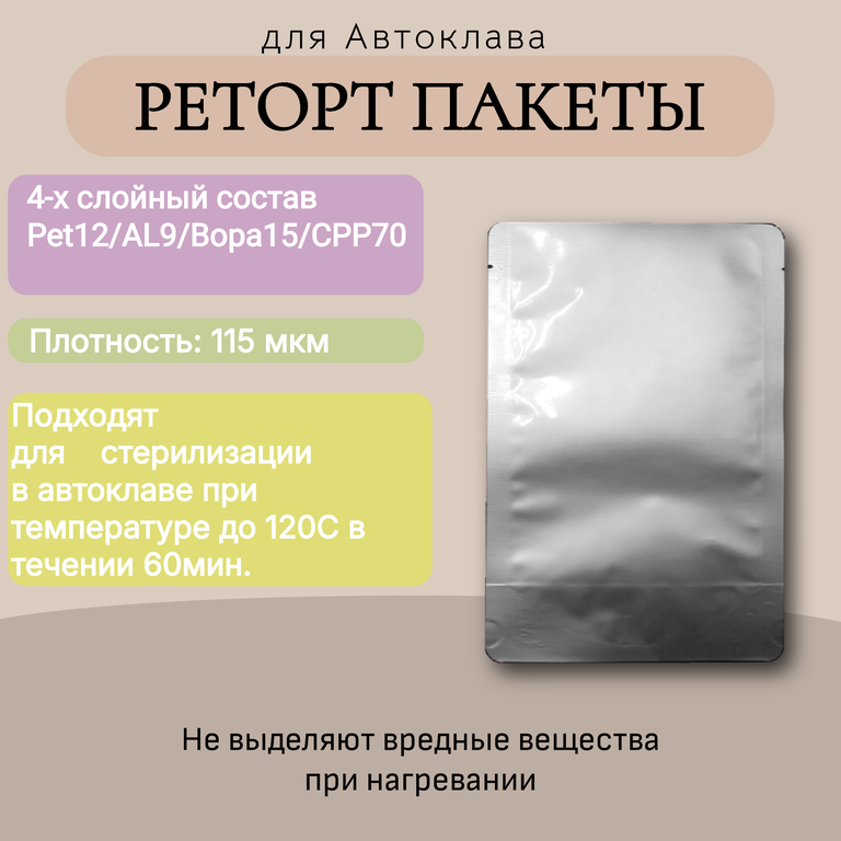 Реторт-пакеты создан для хранения и консервирования продуктов без применения консервантов, состоит из многослойного материала, обладает повышенными защитными свойствами, имеет донную складку, продукты возможно стерилизовать прямо в упаковке при температуре более 100С.