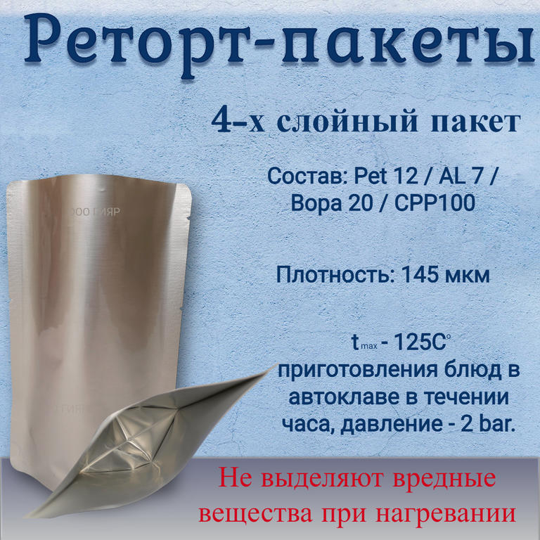 Реторт пакет создан для хранения и консервирования продуктов без применения консервантов, состоит из многослойного материала, обладает повышенными защитными свойствами, имеет донную складку, продукты возможно стерилизовать прямо в упаковке при температуре более 100С.