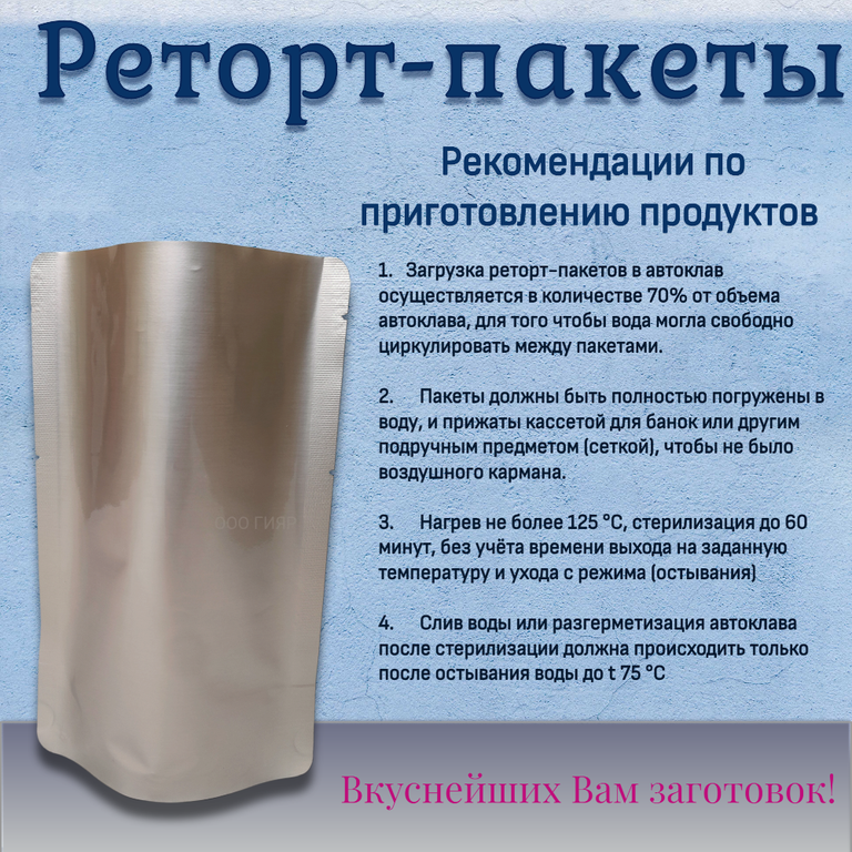 Реторт пакет создан для хранения и консервирования продуктов без применения консервантов, состоит из многослойного материала, обладает повышенными защитными свойствами, имеет донную складку, продукты возможно стерилизовать прямо в упаковке при температуре более 100С.