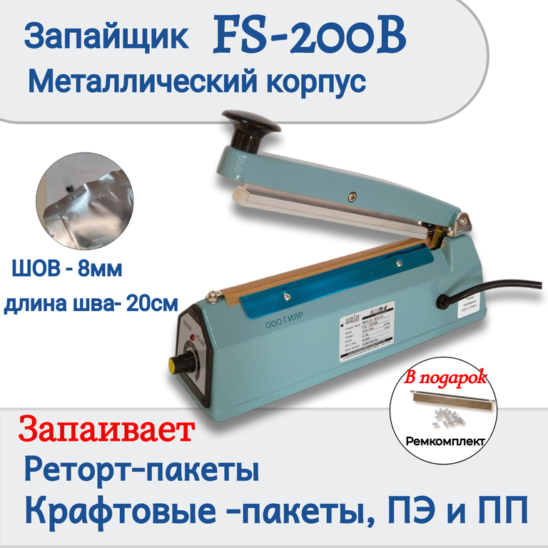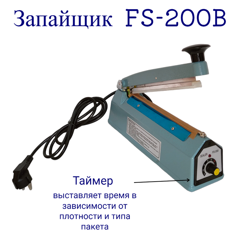 Ручной запайщик FS-200B с функцией проставления даты в зоне шва. Ширина шва при этом 8 мм, дата проставляется методом выдавливания силиконовыми литерами, комплект литер поставляется в комплекте с запайщиком. Литеры вставляются в прижимную запаечную планку, для этого в планке имеются специальные отверстия. Переставив запаечную планку обратной стороной можно получить обыкновенный запаечный шов без даты.